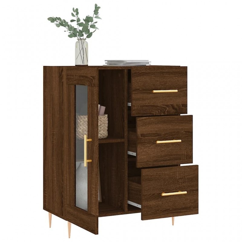 With its timeless design, this classic sideboard is a perfect addition to your home. Sturdy material: Wood is an exceptionally high-quality material with a smooth surface characterized by its strength, stability, and resistance to moisture. Ample storage space: With 3 drawers and 2 compartments behind the sideboard, equipped with a glass door, the sideboard offers plenty of storage space. Space to neatly store various everyday items within easy reach. Presentation: The sturdy top of this cabinet is ideal for displaying decorative objects, paintings, and potted plants. Practical door: You can store your most important items in this piece of furniture in an elegant and organized manner to protect them from dust. Metal legs: The metal legs give it a pleasing appearance and ensure safety while providing stability. Caution: To prevent tipping, this product must be secured with the provided wall bracket.