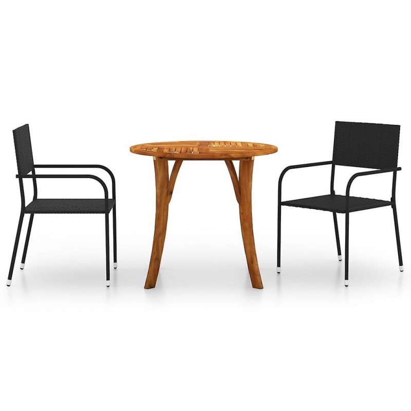 Table: Material: Solid oiled acacia wood Dimensions: 85 x 75 cm (Diameter x H) Table top width: 2 cm Chair: Colour: Black Material: Polyrattan, steel Dimensions: 51 x 60 x 87 cm (W x D x H) Seat width: 48 cm Seat height: 42 cm Assembly required: Yes Delivery includes: 1 table, 2 chairs