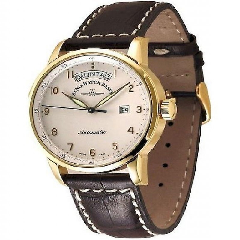 Brand: Zeno Watch Basel Product group: Watches Target group: Men Case color: Yellow gold Crystal: Sapphire crystal Strap material: Leather ? Mm: 42 Case material: Stainless steel Dial color: White ? Other: Display back Other: Swiss Made Display: Analog Strap color: Brown Coating surface: Polished Case shape: Round Watch type: Automatic watches Movement type: Automatic Clasp type: Pin buckle