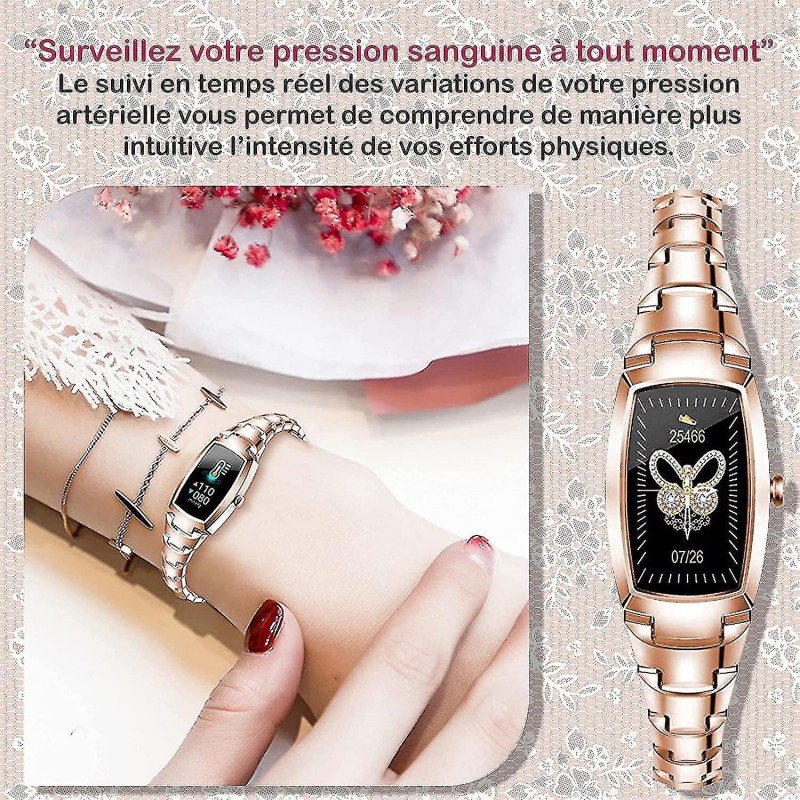 Smart Watch & Health Tracker This smart watch allows you to accurately record all-day activities, such as steps, distance traveled, calories burned, heart rate, sleep status, and much more. This smart watch supports multiple sports modes. Something to keep you motivated all day long. This smart watch is a great gift option. Call & Message Notifications These smart watches (rose gold or silver) will vibrate when you receive incoming calls or messages (Facebook, Twitter, WhatsApp, Line, Skype, Twitter, WeChat, etc.). You will be able to see the message content directly on the watch. If you are busy, you can hang up the call directly. These stylish, high-tech IP67 women's watches have the smartest features on the market, such as synchronized weather forecasts, sedentary reminders, a vibrating alarm clock, full music and camera control, and control your phone through the watch screen, a stopwatch, brightness adjustment (raise your wrist to brighten the screen), magnetic fast charging, and more. More than just a women's watch This smartwatch uses a 1.09-inch (2.54 cm) IPS HD touch screen and is made of stainless steel to give you a better experience - all for a stylish look. Blood pressure, blood oxygen levels and menstrual cycle are also part of this watch's applications: you will have complete monitoring. Long battery life and wide compatibility The women's Bluetooth watch is compatible with Android 4.4 or IOS 8.0 and above (Bluetooth 4.0 or above is required), it is only suitable for smartphone connection, not for PC, iPad, tablet. Scan the QR code or download/install the "F Fit" APP from your mobile app store. Open it and turn on Bluetooth. Click "Add device" and select the watch. Enjoy